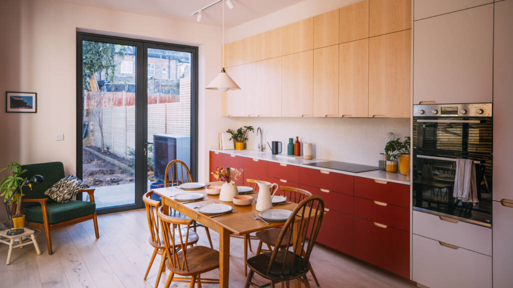 The heart of the home is the kitchen-diner. Bathed in natural light, it features a bold palette of pale blue and vibrant red, softened by muted timber cabinetry with elegant cutaway handles. The layout maximises space, flow, and comfort, while bespoke joinery and tailored design details add warmth and personality. This family-friendly design blends modern aesthetics with practical, sustainable living.